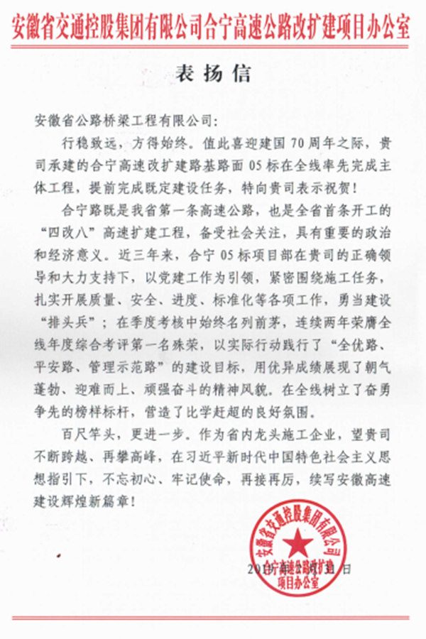近日,合寧05標項目部收到項目辦發(fā)來的表揚信,對項目全線率先完成主體工程建設任務表示祝賀,對項目團隊管理水平、工程形象進度等工作給予了表揚。