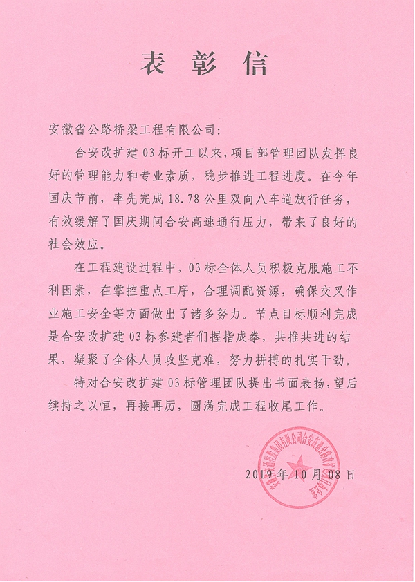 近日,合安高速改擴(kuò)建項(xiàng)目辦發(fā)來(lái)表彰信,對(duì)公司承建的第三標(biāo)段給予書(shū)面表?yè)P(yáng)。