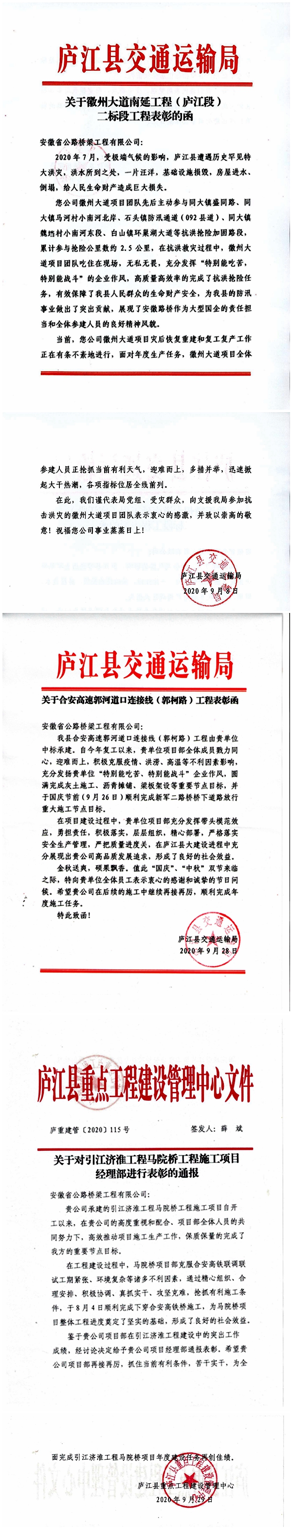 近日,廬江縣交通運(yùn)輸局、廬江縣重點(diǎn)工程建設(shè)管理中心先后發(fā)來(lái)表彰信,對(duì)公司承建的徽州大道南延工程(廬江段)二標(biāo)段、合安高速郭河道口連接線(xiàn)(郭柯路)工程、引江濟(jì)淮馬院橋工程項(xiàng)目戰(zhàn)疫情、抗洪水、搶進(jìn)度、樹(shù)形象,高標(biāo)準(zhǔn)、高質(zhì)量推進(jìn)施工生產(chǎn)給予表?yè)P(yáng)和感謝。