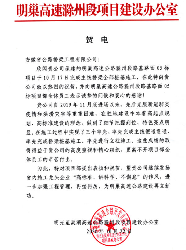近日,明巢高速滁州段項(xiàng)目辦發(fā)來(lái)賀電,對(duì)公司承建的明巢高速路基路面05標(biāo)項(xiàng)目完成主線橋梁全部樁基施工任務(wù)表示祝賀,并向全體參建人員表示感謝。