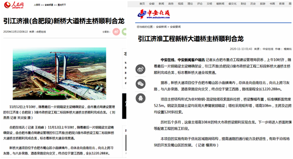 11月12日上午10時,隨著最后一片鋼箱梁主梁精確架設(shè),公司承建的引江濟淮(合肥段)3座市政橋梁工程二標段新橋大道橋主橋順利完成合龍,全線實現(xiàn)貫通,人民網(wǎng)、中安在線、安徽電視臺、合肥電視臺等多家主流媒體聚焦報道。