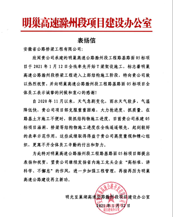 1月12日,明巢高速滁州段項(xiàng)目辦給公司來信,對(duì)公司承建的明巢高速05標(biāo)在全線率先開始T梁架設(shè)進(jìn)行表揚(yáng)。