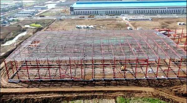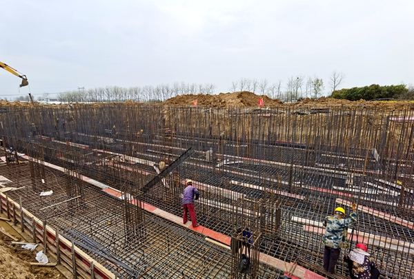 2021年1月4日,在基地藍(lán)圖繪就的基礎(chǔ)上,廠房和辦公生活設(shè)施項(xiàng)目部進(jìn)場施工。他們克服了土地征收、連續(xù)多雨天氣、拆遷困難、樹木砍伐等不利因素,發(fā)揚(yáng)“特別能吃苦、特別能戰(zhàn)斗”的企業(yè)作風(fēng),解決了一個(gè)又一個(gè)棘手的問題,加班加點(diǎn)推進(jìn)基地基礎(chǔ)設(shè)施建設(shè)。截至3月底,吳山產(chǎn)業(yè)化基地項(xiàng)目3#管片生產(chǎn)車間地基基礎(chǔ)、短柱、框梁施工完成100%;3#管片生產(chǎn)車間鋼柱、鋼梁等主體結(jié)構(gòu)安裝完成70%,拌合站主機(jī)、粉煤灰罐基礎(chǔ)完成100%。