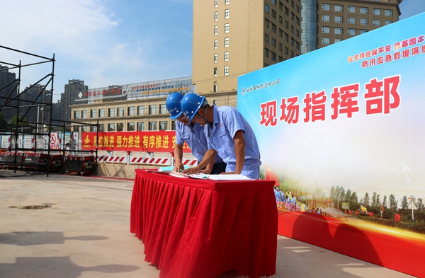 此次演練背景為多日連續(xù)降雨造成施工現(xiàn)場基坑積水,嚴重影響基坑穩(wěn)定和施工人員人身安全。在積水超過警戒水位后,項目部應急救援領(lǐng)導小組立即啟動應急預案,開展應急救援工作。演練按預警報告、集合分工、基坑監(jiān)測、筑壩攔水、快速排水、醫(yī)療救助和匯報總結(jié)等流程進行。參演人員分成警戒保衛(wèi)、醫(yī)療救護、技術(shù)指導、物資供應、現(xiàn)場搶險五個小組,按照預案,提前演練、各司其職、密切配合,確保了防汛應急救援演練活動順利完成。