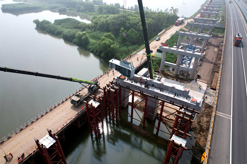 為確保首片鋼箱梁架設(shè)順利安全進(jìn)行,項(xiàng)目部根據(jù)施工要求提前籌劃,編制專項(xiàng)施工方案及應(yīng)急預(yù)案,對(duì)作業(yè)人員進(jìn)行專項(xiàng)培訓(xùn)和詳細(xì)安全技術(shù)交底,對(duì)架設(shè)全過(guò)程做了詳細(xì)周密的部署安排,為首梁的順利架設(shè)奠定了堅(jiān)實(shí)的基礎(chǔ)。架設(shè)過(guò)程中,項(xiàng)目部嚴(yán)格按照施工規(guī)范、質(zhì)量安全體系標(biāo)準(zhǔn),在監(jiān)理單位的監(jiān)督指導(dǎo)下,對(duì)提、運(yùn)、架等關(guān)鍵工序?qū)訉影殃P(guān),梁片架設(shè)各環(huán)節(jié)、各工種有條不紊地進(jìn)行著,最終實(shí)現(xiàn)了首片鋼箱梁的安全有序精準(zhǔn)架設(shè),標(biāo)志著項(xiàng)目橋梁上部結(jié)構(gòu)施工進(jìn)入了嶄新階段,為加快實(shí)現(xiàn)建設(shè)目標(biāo)邁出了堅(jiān)實(shí)的一步。