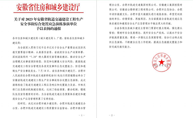 近日,安徽省住房和城鄉(xiāng)建設(shè)廳發(fā)文通報表揚安徽建工集團控股有限公司、安徽省公路橋梁工程有限公司在2023年度安徽省軌道交通建設(shè)工程綜合處置應急演練中所作出的突出貢獻和優(yōu)異表現(xiàn)。