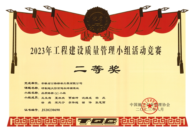 8月11日,中國(guó)施工企業(yè)管理協(xié)會(huì)“2023年(首屆)工程建設(shè)行業(yè)質(zhì)量管理小組活動(dòng)高質(zhì)量發(fā)展大會(huì)”在山西太原順利閉幕。會(huì)議對(duì)各地區(qū)及行業(yè)協(xié)會(huì)推薦的1468個(gè)優(yōu)秀QC成果進(jìn)行了集中發(fā)布,其中橋梁分公司申報(bào)的QC成果《提高溫控管接頭安裝一次性驗(yàn)收合格率》榮獲一等獎(jiǎng),市政分公司申報(bào)的QC成果《提高地下車(chē)庫(kù)地坪施工合格率》《研制超大仿石道板磚鋪裝機(jī)》榮獲二等獎(jiǎng)。
