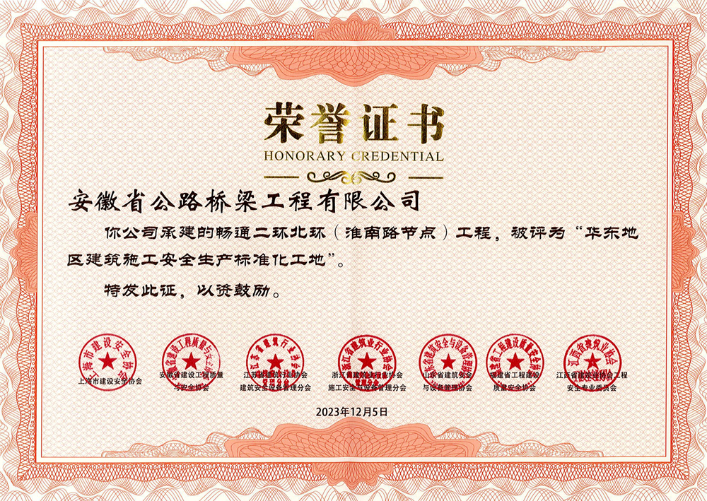 近日,華東地區(qū)建筑安全聯(lián)誼會公布2023年度華東地區(qū)建筑施工安全生產(chǎn)標準化工地名單,公司承建的暢通二環(huán)北環(huán)(淮南路節(jié)點)工程項目光榮上榜。