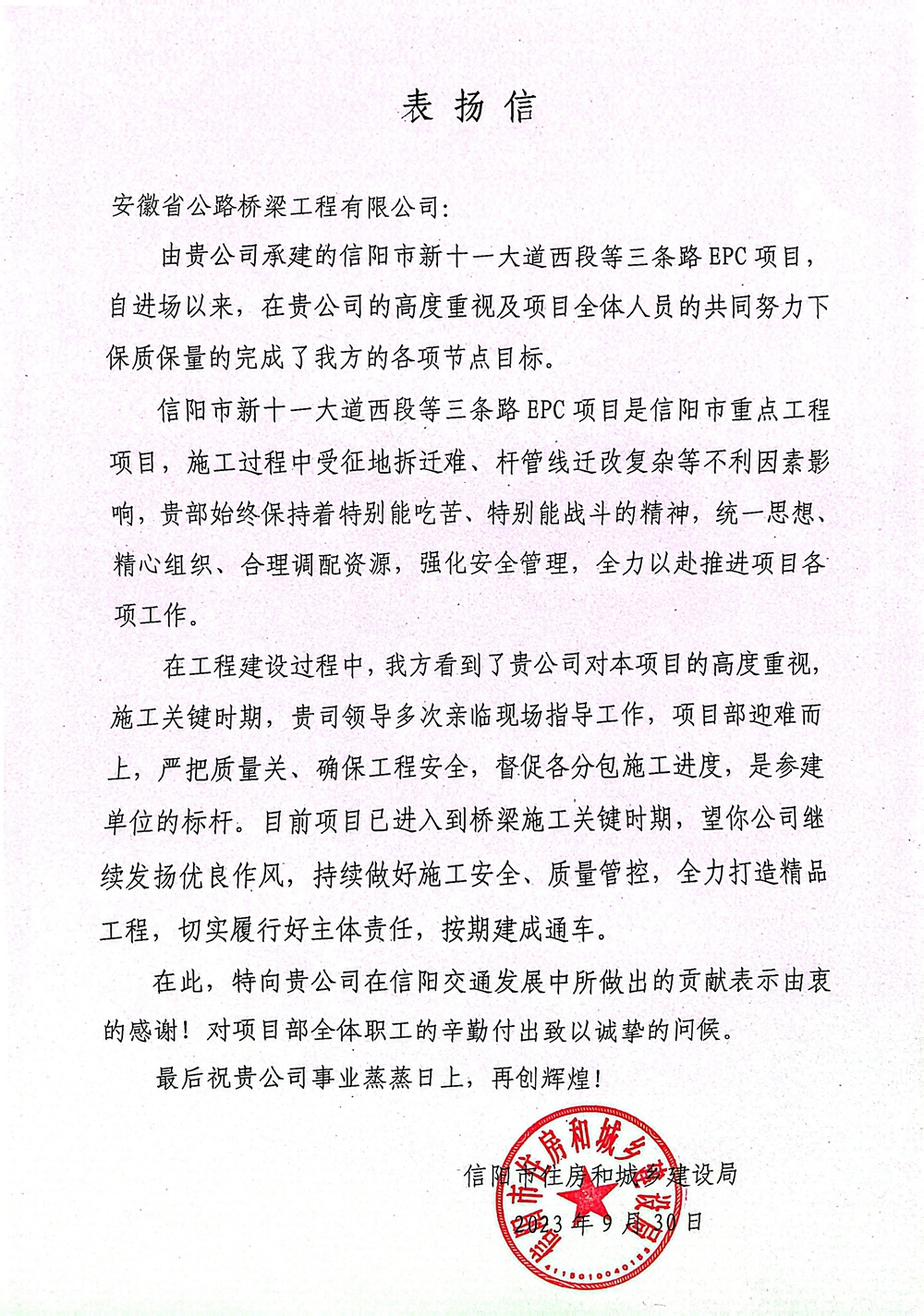 信陽(yáng)市住房和城鄉(xiāng)建設(shè)局來(lái)信指出,信陽(yáng)新十一大道項(xiàng)目在施工過(guò)程中克服征地拆遷難、桿管線遷改復(fù)雜等不利因素影響,始終發(fā)揚(yáng)“特別能吃苦、特別能戰(zhàn)斗”的企業(yè)作風(fēng),嚴(yán)把質(zhì)量關(guān)、安全關(guān),高質(zhì)高效推進(jìn)項(xiàng)目建設(shè),為信陽(yáng)交通發(fā)展做出了突出貢獻(xiàn)。
