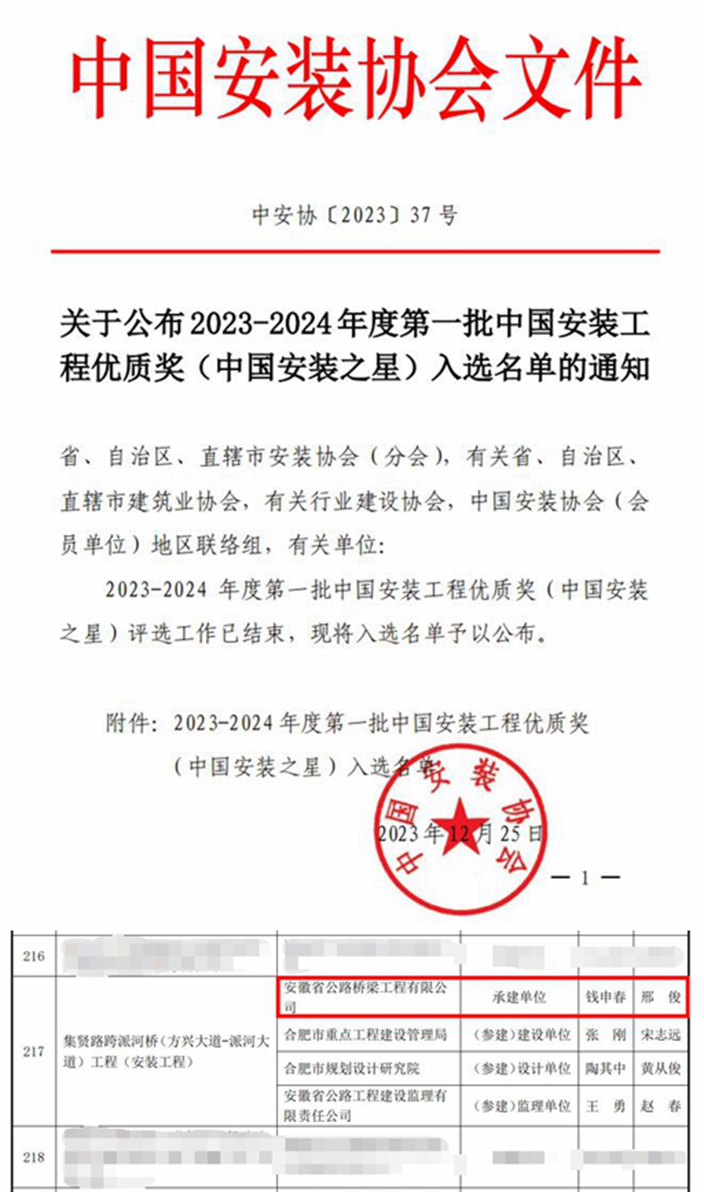 12月25日,中國安裝協(xié)會(huì)公布了2023-2024年度第一批中國安裝工程優(yōu)質(zhì)獎(jiǎng)(中國安裝之星)入選名單,公司承建的集賢路跨派河橋(方興大道-派河大道)工程榜上有名。此項(xiàng)目是中國安裝工程優(yōu)質(zhì)獎(jiǎng)(中國安裝之星)歷年獲獎(jiǎng)項(xiàng)目中首個(gè)市政橋梁項(xiàng)目,也是公司首個(gè)獲得中國安裝工程優(yōu)質(zhì)獎(jiǎng)(中國安裝之星)的項(xiàng)目。