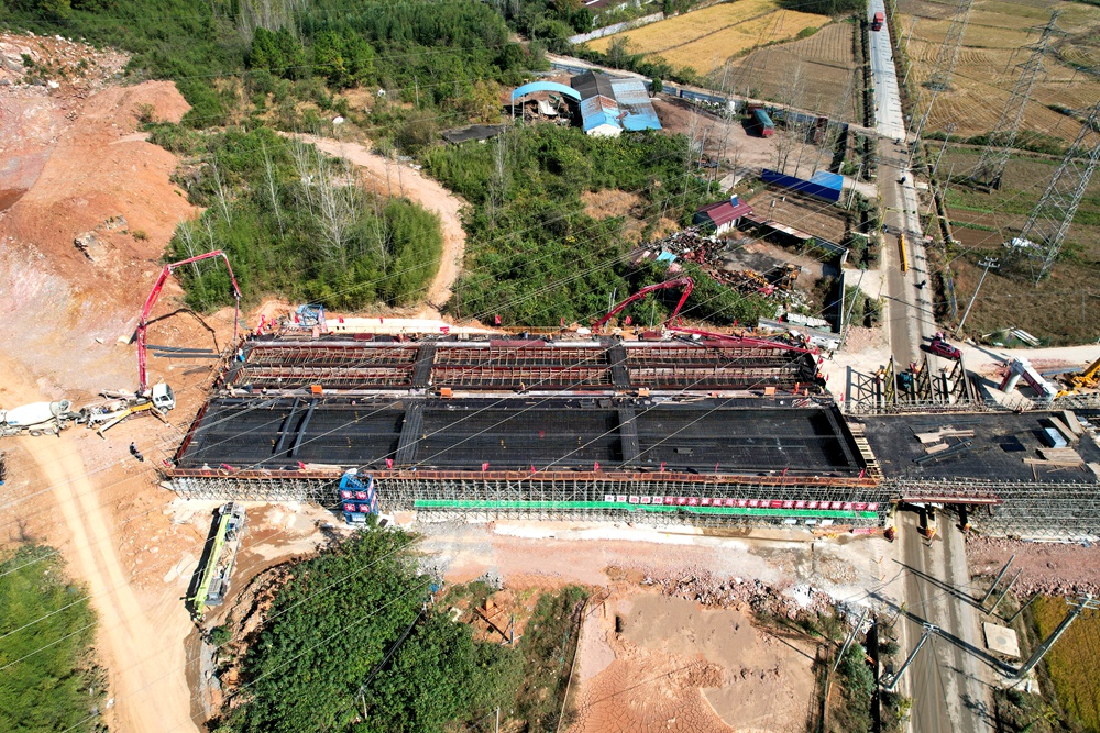工程建設制勝在關鍵點,項目部始終堅持把關鍵節(jié)點工程攻堅作為“頭號工程”。水東四號橋位于象山腳下,橫跨鄉(xiāng)道施工,施工組織難度大,安全風險高。項目積極組織工作專班,通過優(yōu)化方案、細化分工、倒排工期和現(xiàn)場監(jiān)督等措施,并積極對接當?shù)卣陀嘘P電力部門,多番實地考察、測量,保障施工過程的有序性、高效性和安全性。2023年11月8日上午,水東四號橋首件現(xiàn)澆梁順利澆筑完成,標志著項目關鍵施工節(jié)點取得突破性進展。