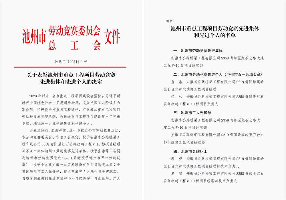 近日,池州市勞動競賽委員會、市總工會印發(fā)《關(guān)于表彰池州市重點工程項目勞動競賽先進集體和先進個人的決定》,公司所屬S358青陽至紅石公路改建工程W10標項目經(jīng)理部獲評“市勞動競賽先進集體”,金鑫、江林兩名同志獲評“市勞動競賽先進個人”,同時授予池州市五一勞動獎?wù)拢籗358改建W10標、S219青陽改建兩個項目獲評“市工人先鋒號”,蔣威、夏端兩名同志獲評池州市“金牌職工”。