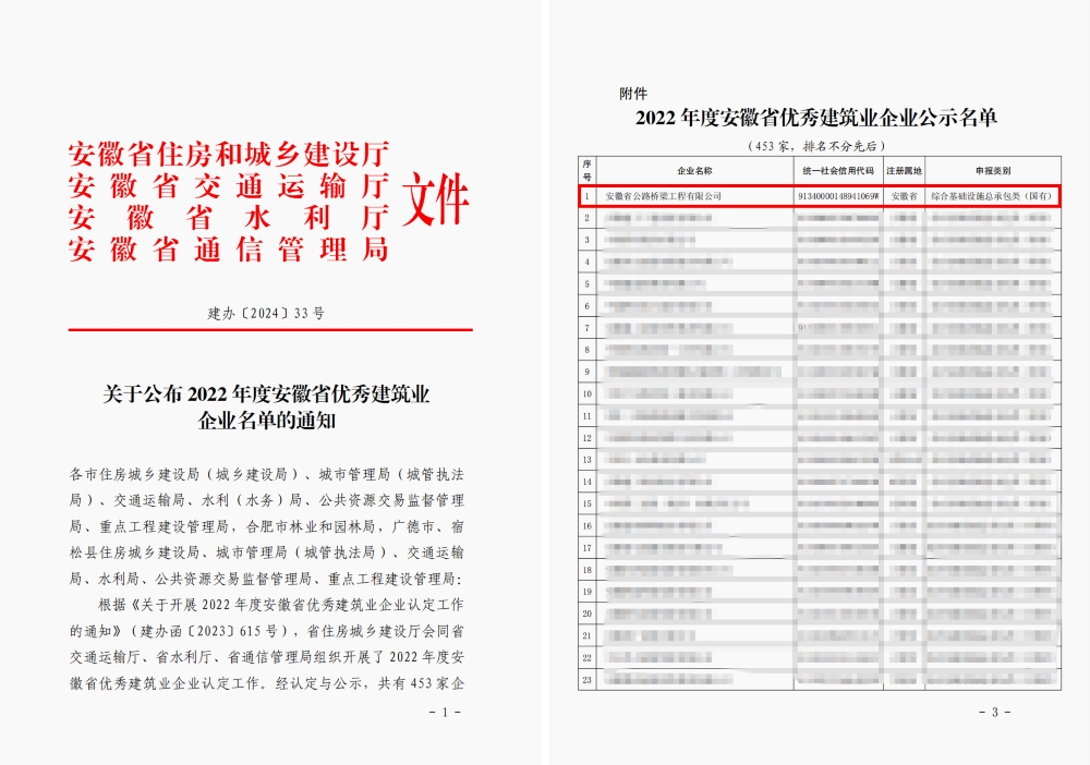 近日,安徽省住房和城鄉(xiāng)建設(shè)廳、安徽省交通運(yùn)輸廳、安徽省水利廳、安徽省通信管理局聯(lián)合公布了“2022年度安徽省優(yōu)秀建筑業(yè)企業(yè)”名單,公司連續(xù)三年以綜合基礎(chǔ)設(shè)施總承包類別成功入選。