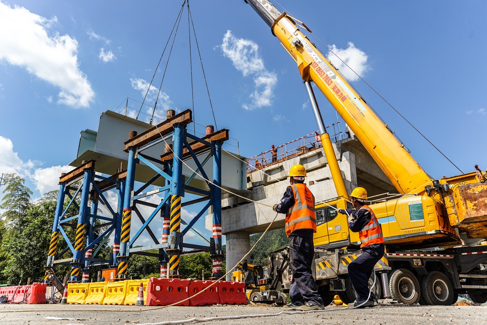 首件鋼箱梁長11.4米,跨G205國道,涉路施工壓力較大。施工過程中,項目積極對接當?shù)亟痪炔块T,做好交通導改,有效保障了鋼箱梁安全架設。