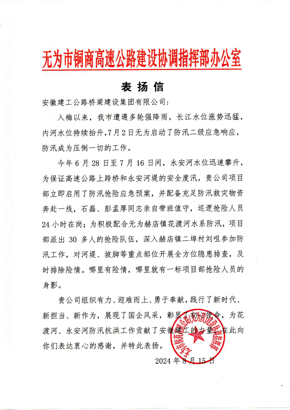 無(wú)為市銅商高速公路(無(wú)為段)建設(shè)協(xié)調(diào)指揮部對(duì)公司承建的銅商高速主體1標(biāo)項(xiàng)目部進(jìn)行表?yè)P(yáng)。來(lái)信指出,汛期期間,項(xiàng)目部及時(shí)啟動(dòng)防汛搶險(xiǎn)應(yīng)急預(yù)案,配足物資奔赴一線(xiàn),迎難而上,安排人員24小時(shí)巡邏,開(kāi)展全方位隱患排查,為防汛抗洪工作作出了突出貢獻(xiàn),展現(xiàn)了國(guó)企擔(dān)當(dāng)。