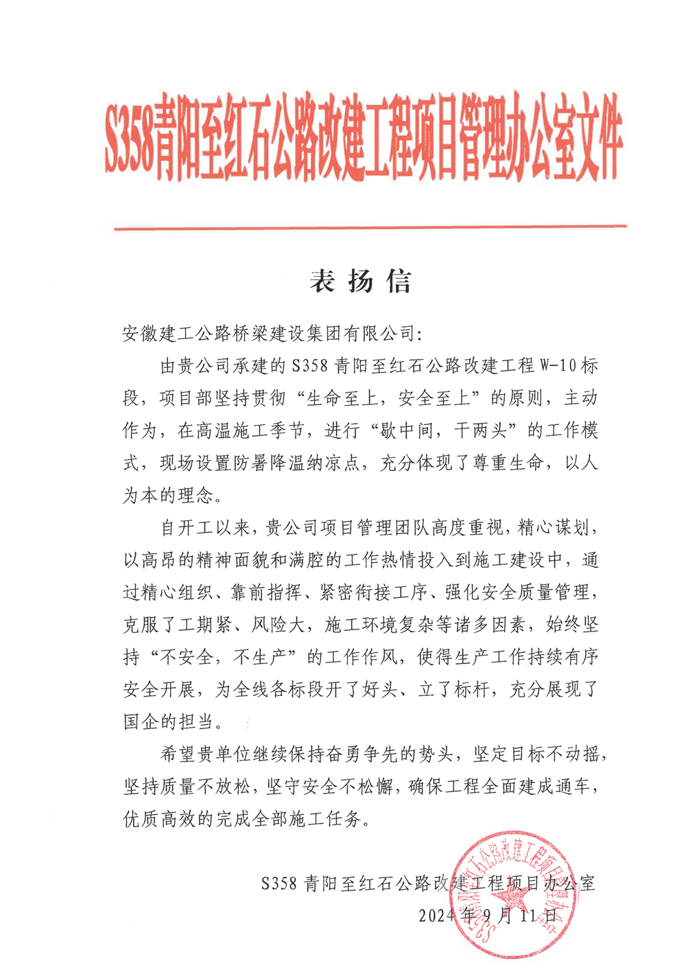 S358青陽(yáng)至紅石公路改建工程項(xiàng)目辦公室來(lái)信指出,公司承建的W10標(biāo)在高溫施工季節(jié),堅(jiān)持貫徹“生命至上,安全至上”的原則、“不安全,不生產(chǎn)”的工作作風(fēng),落實(shí)防暑降溫措施和安全生產(chǎn)各項(xiàng)要求,體現(xiàn)了“以人為本”的理念。