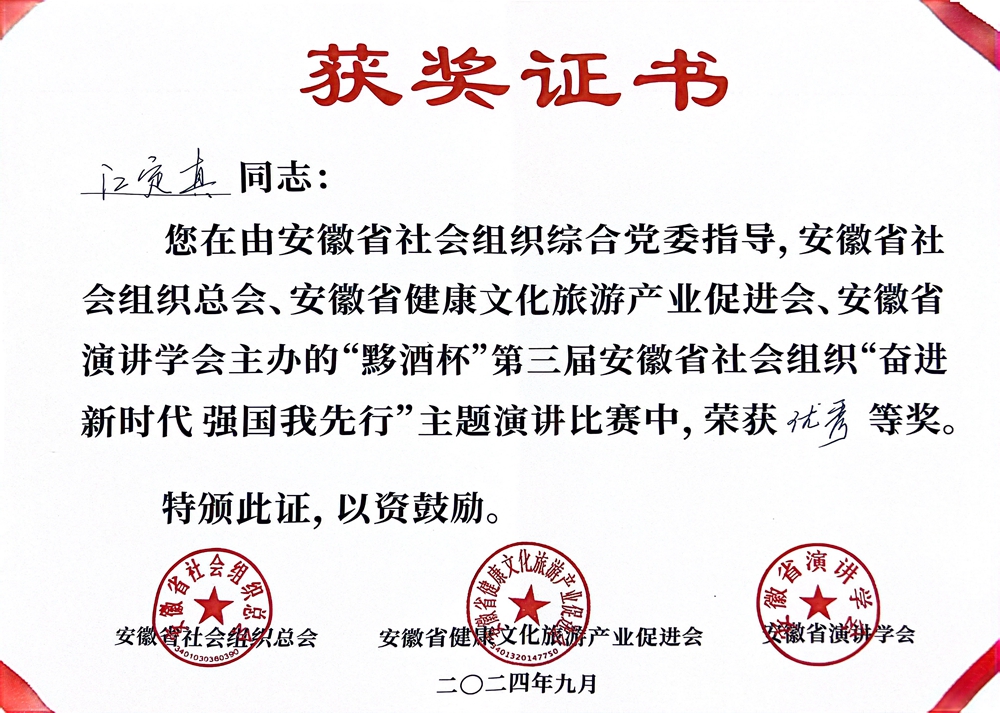 9月21日,第三屆安徽省社會(huì)組織“奮進(jìn)新時(shí)代 強(qiáng)國(guó)我先行”主題演講比賽復(fù)賽、決賽在合肥舉行,公司選送參賽選手江定真參加角逐,經(jīng)過激烈比拼,榮獲優(yōu)秀獎(jiǎng)。