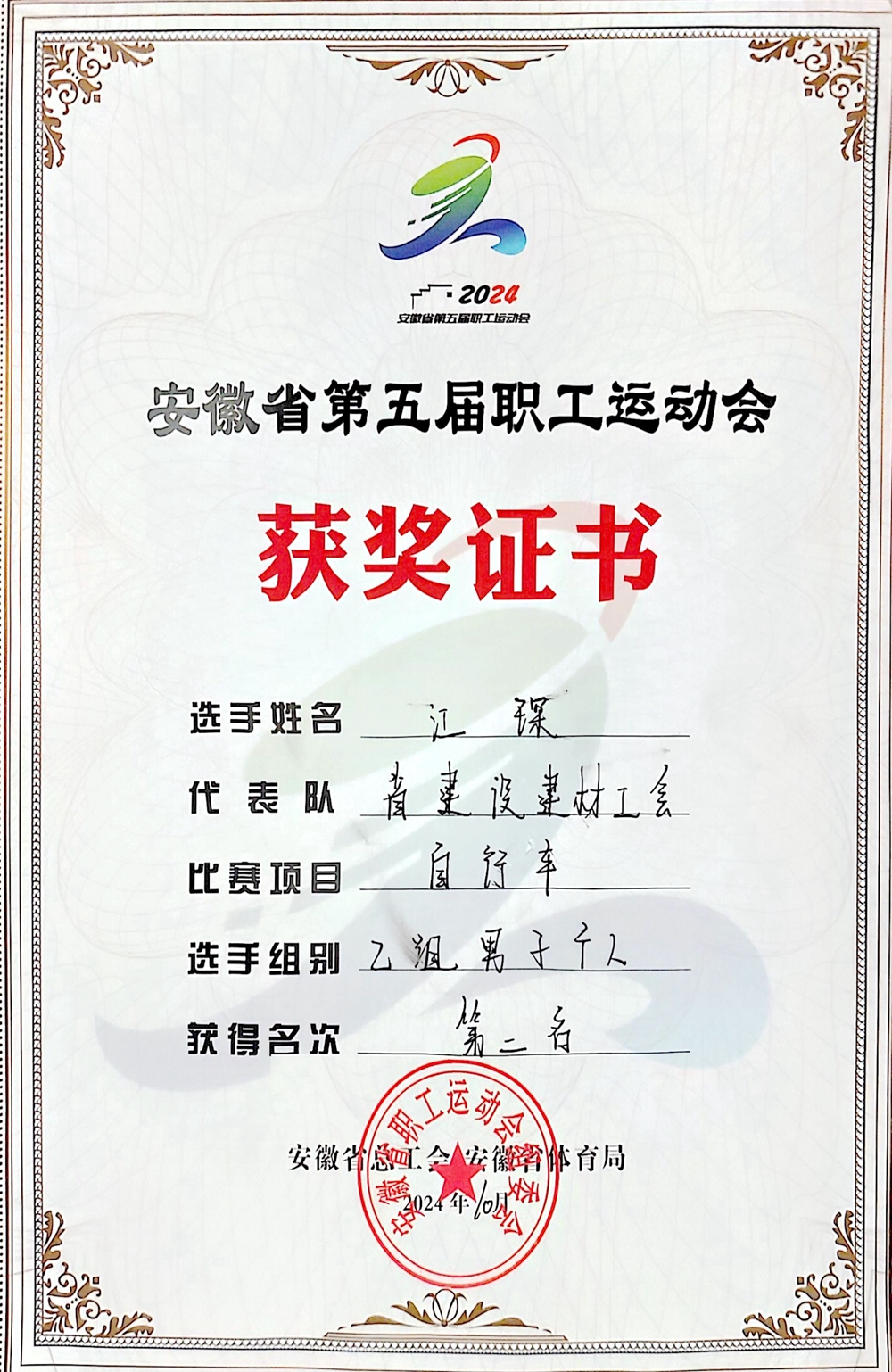10月13日,由安徽省總工會、安徽省體育局聯(lián)合舉辦的省第五屆職工運(yùn)動會自行車比賽在池州舉行,公司選送的參賽選手江琛代表省建設(shè)建材工會參加角逐,經(jīng)過激烈比拼,取得乙組自行車男子個人第二名的優(yōu)異成績。