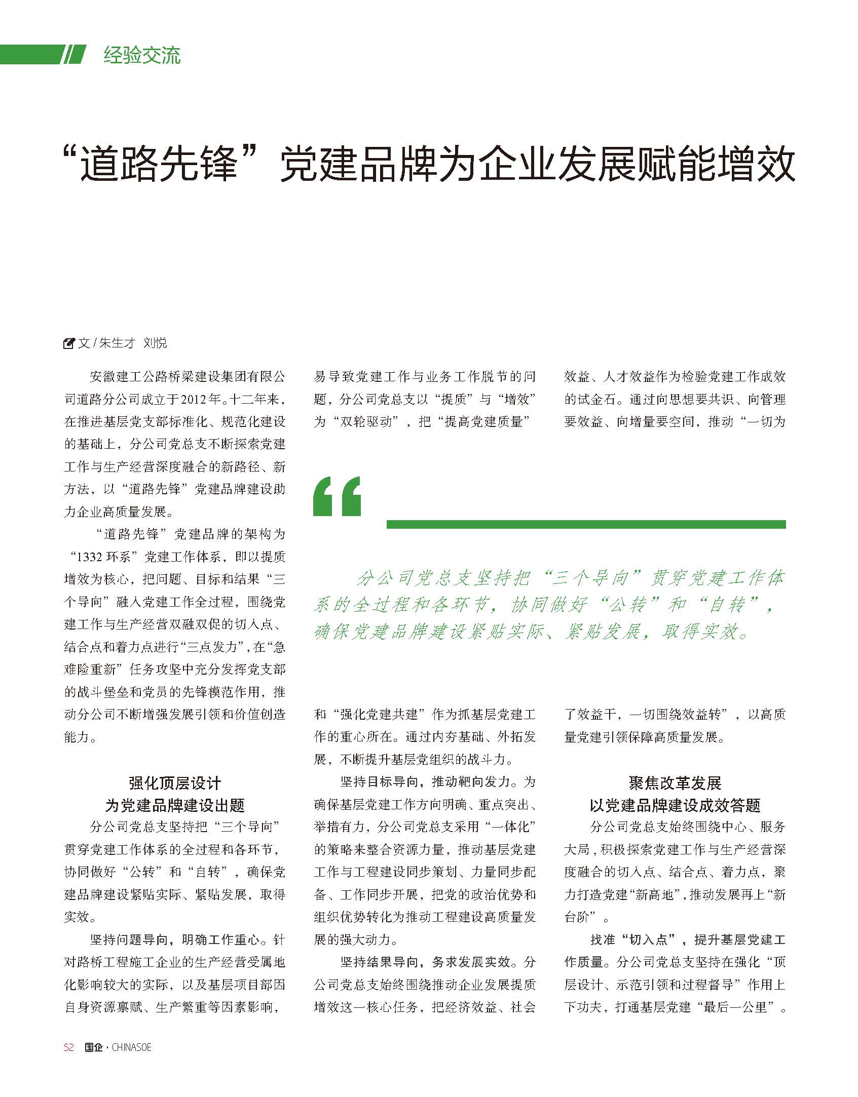 近日,《國企》雜志2024年10月第20期和《國企黨建研究》微信公眾號刊發(fā)文章《“道路先鋒”黨建品牌為企業(yè)發(fā)展賦能增效》,對安徽建工路橋道路分公司“道路先鋒”黨建品牌創(chuàng)建經(jīng)驗進行了報道。