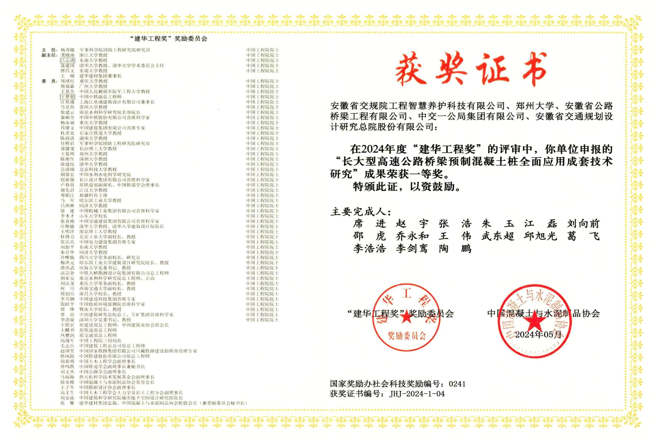 近日,中國(guó)混凝土與水泥制品協(xié)會(huì)頒發(fā)了2024年度“建華工程獎(jiǎng)”,公司申報(bào)的《長(zhǎng)大型高速公路橋梁預(yù)制混凝土樁全面應(yīng)用成套技術(shù)研究》成果榮獲一等獎(jiǎng)。