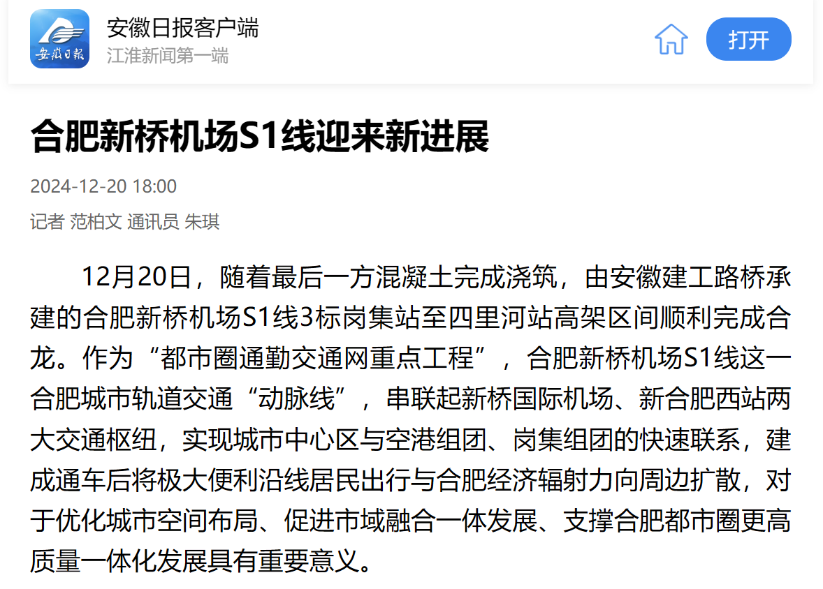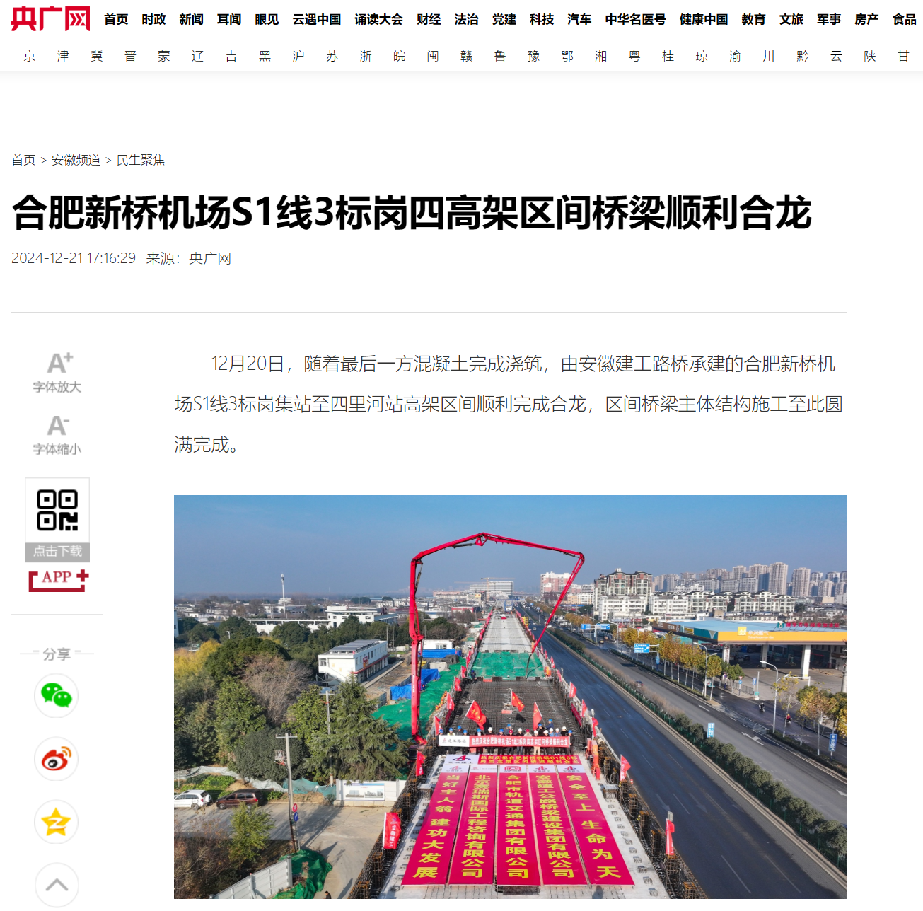【名媒聚焦】央廣網(wǎng)、安徽日報、中安在線等主流媒體聚焦報道合肥新橋機場S1線3標(biāo)崗四高架區(qū)間橋梁合龍