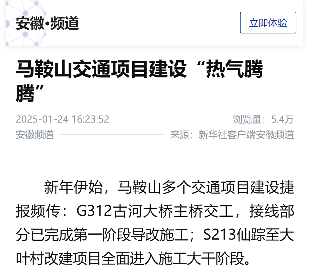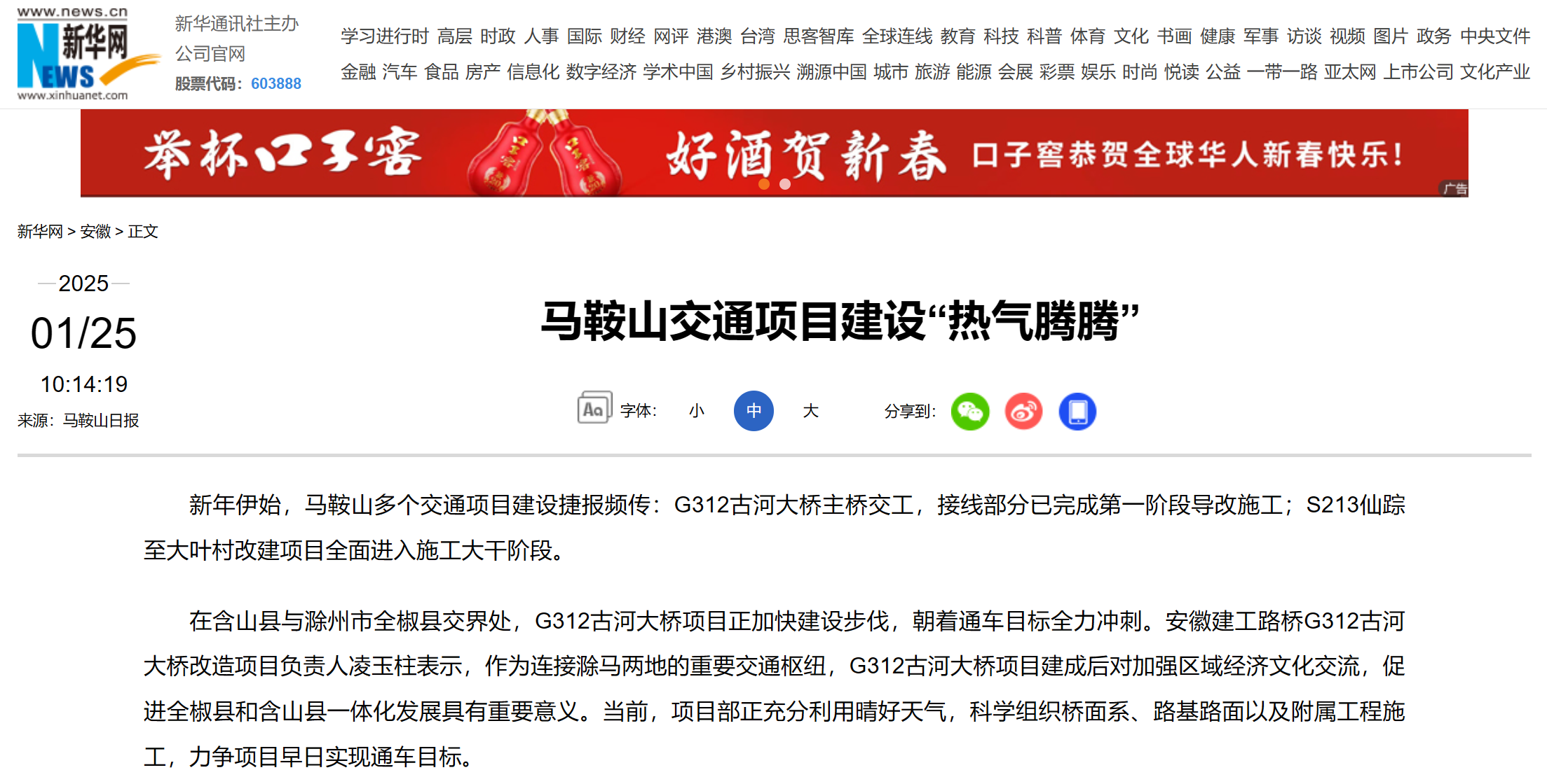 新年伊始,馬鞍山多個交通項目建設(shè)捷報頻傳:G312古河大橋主橋交工,接線部分已完成第一階段導改施工;S213仙蹤至大葉村改建項目全面進入施工大干階段。