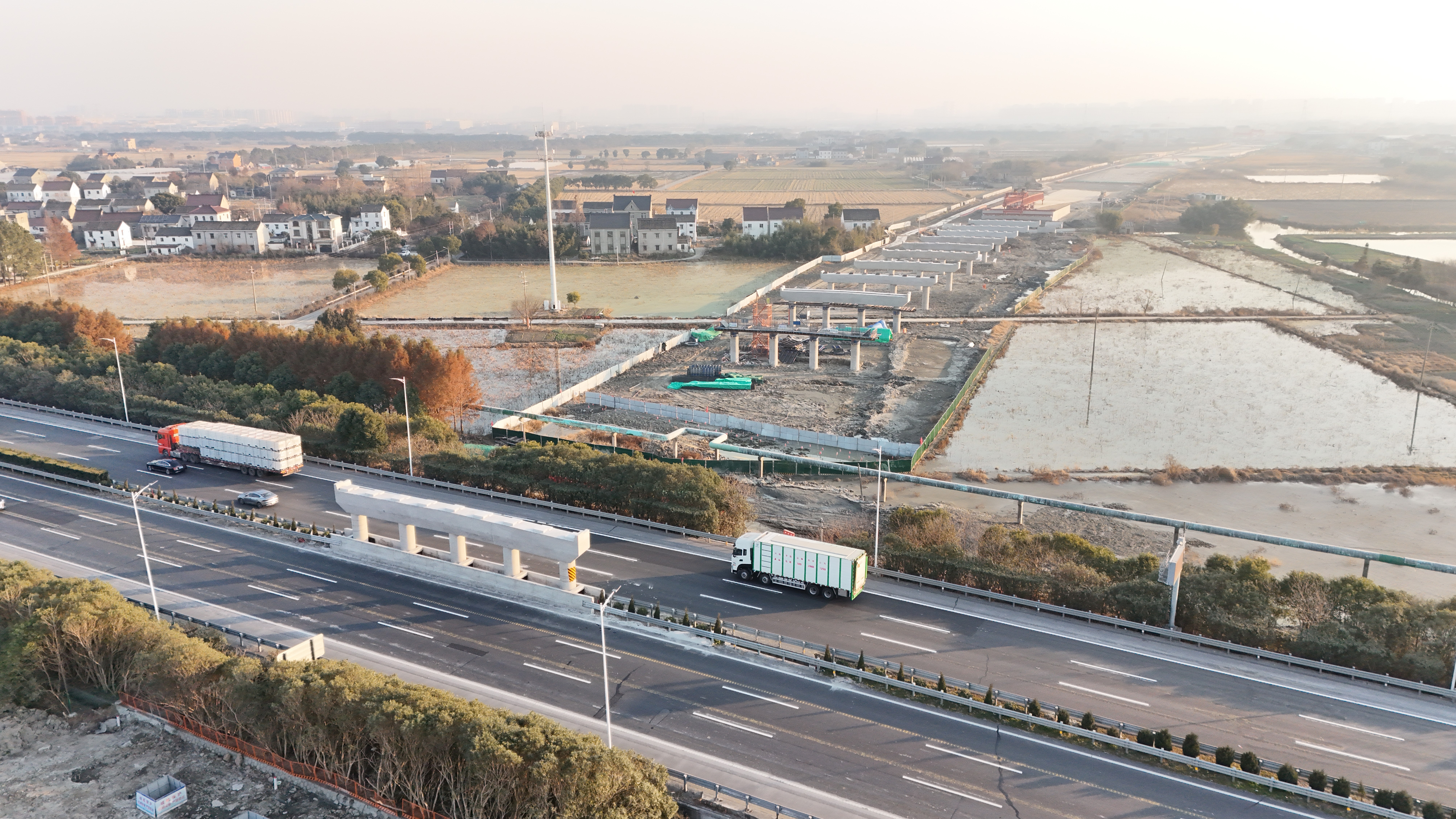作為嘉興市融入長三角一體化發(fā)展重大交通基礎(chǔ)設(shè)施,也是浙江與江蘇連接的重要省際通道,524國道二期TJ01標(biāo)段路線全長5.95公里,設(shè)計(jì)速度80公里/小時(shí),路基寬度33米,涵蓋兆里大橋、范灘大橋、大興橋等橋梁7座(其中大橋3座,中橋4座)。