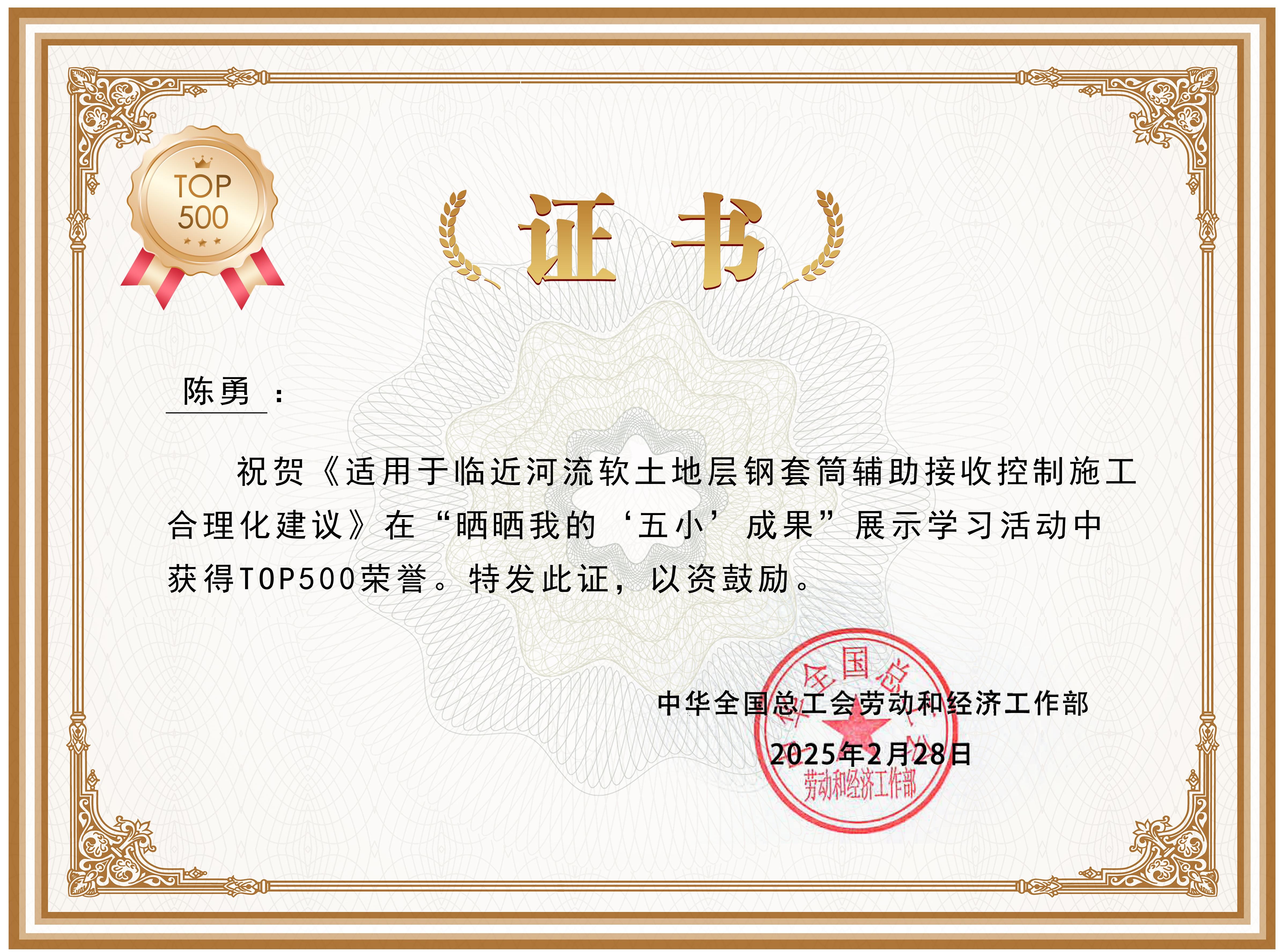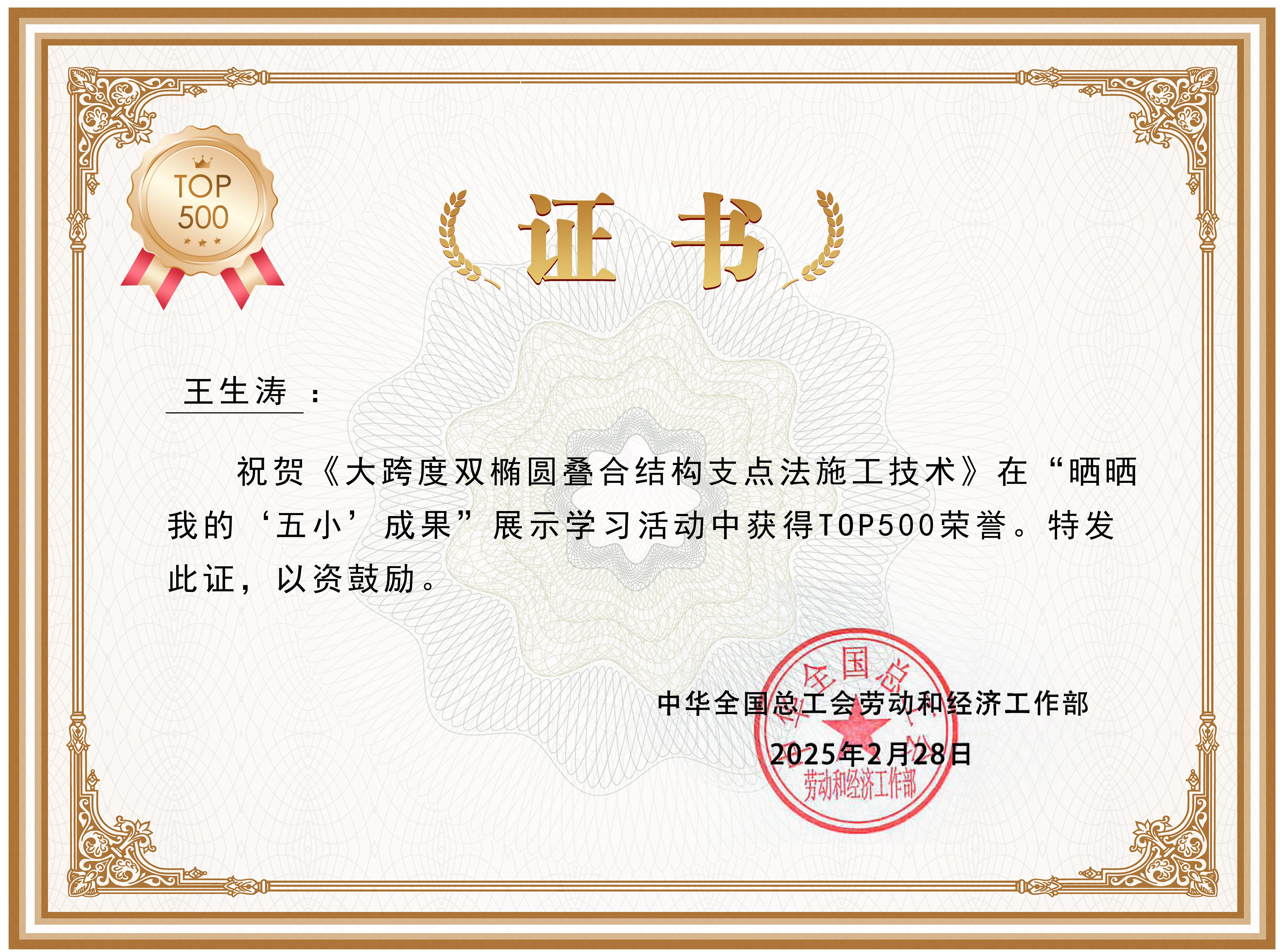 近日,中華全國總工會“曬曬我的‘五小’成果”展示學(xué)習(xí)活動結(jié)果揭曉,公司選送的《大跨度雙橢圓疊合結(jié)構(gòu)支點法施工技術(shù)》《適用于臨近河流軟土地層鋼套筒輔助接收控制施工合理化建議》經(jīng)過多輪投票,在5000個參選成果中脫穎而出,獲得TOP500殊榮,分別位列80名和147名。