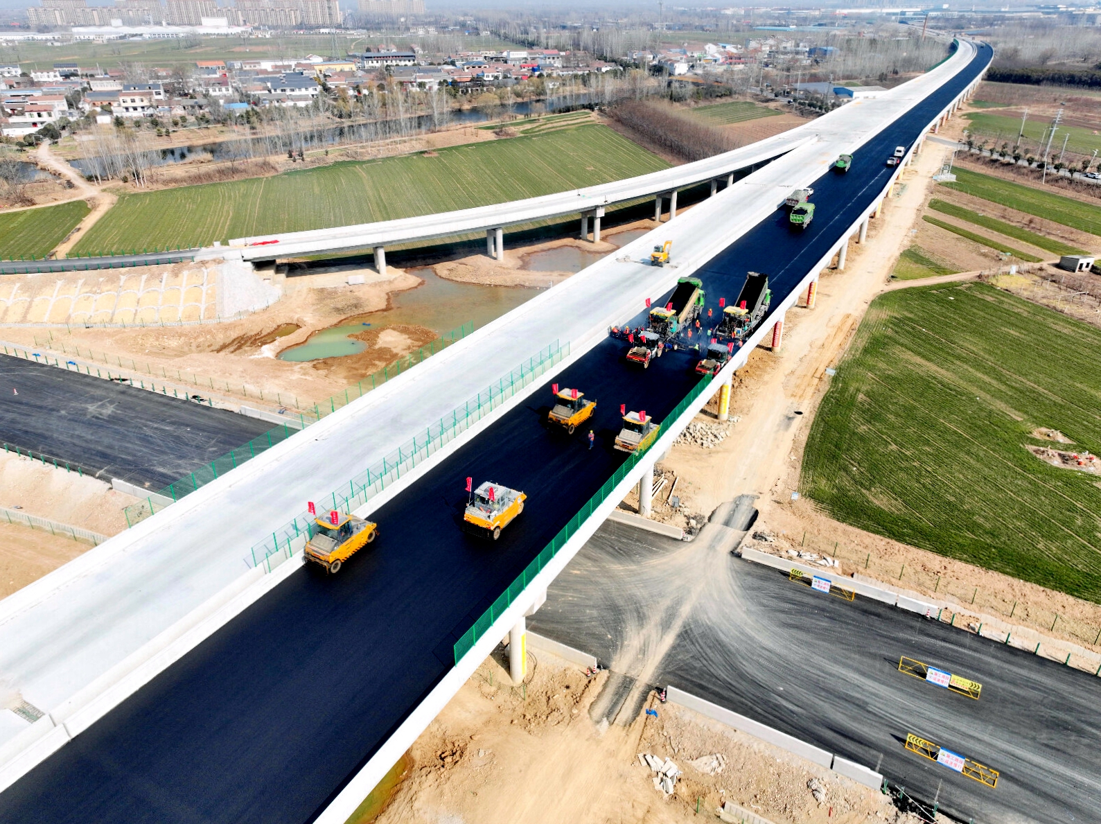 在徐淮阜高速淮北段,項目錨定7月通車目標(biāo),堅持節(jié)假日施工“不斷檔”,順利完成全線水穩(wěn)攤鋪施工,正加速推進(jìn)瀝青路面施工。