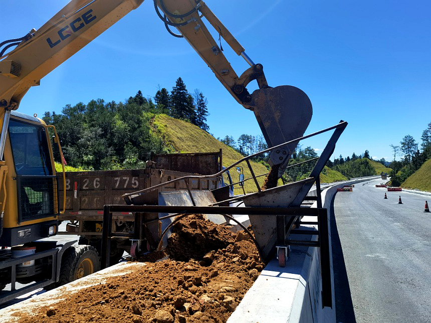 中分填土實現(xiàn)零污染。傳統(tǒng)高速公路中分帶培植用土施工,極易造成路面污染。為解決該難題,公司創(chuàng)新研發(fā)中分帶新澤西護欄間填土漏斗裝置,根據(jù)現(xiàn)場護欄尺寸、填土高度,制作填土漏斗,填土施工通過漏斗槽滑入護欄內(nèi)部,避免外溢,同時漏斗可以在護欄頂部和側(cè)面自由滑動,實現(xiàn)中分帶填土零污染施工,有效保證路面清潔施工,較傳統(tǒng)工藝施工效率提高50%左右。