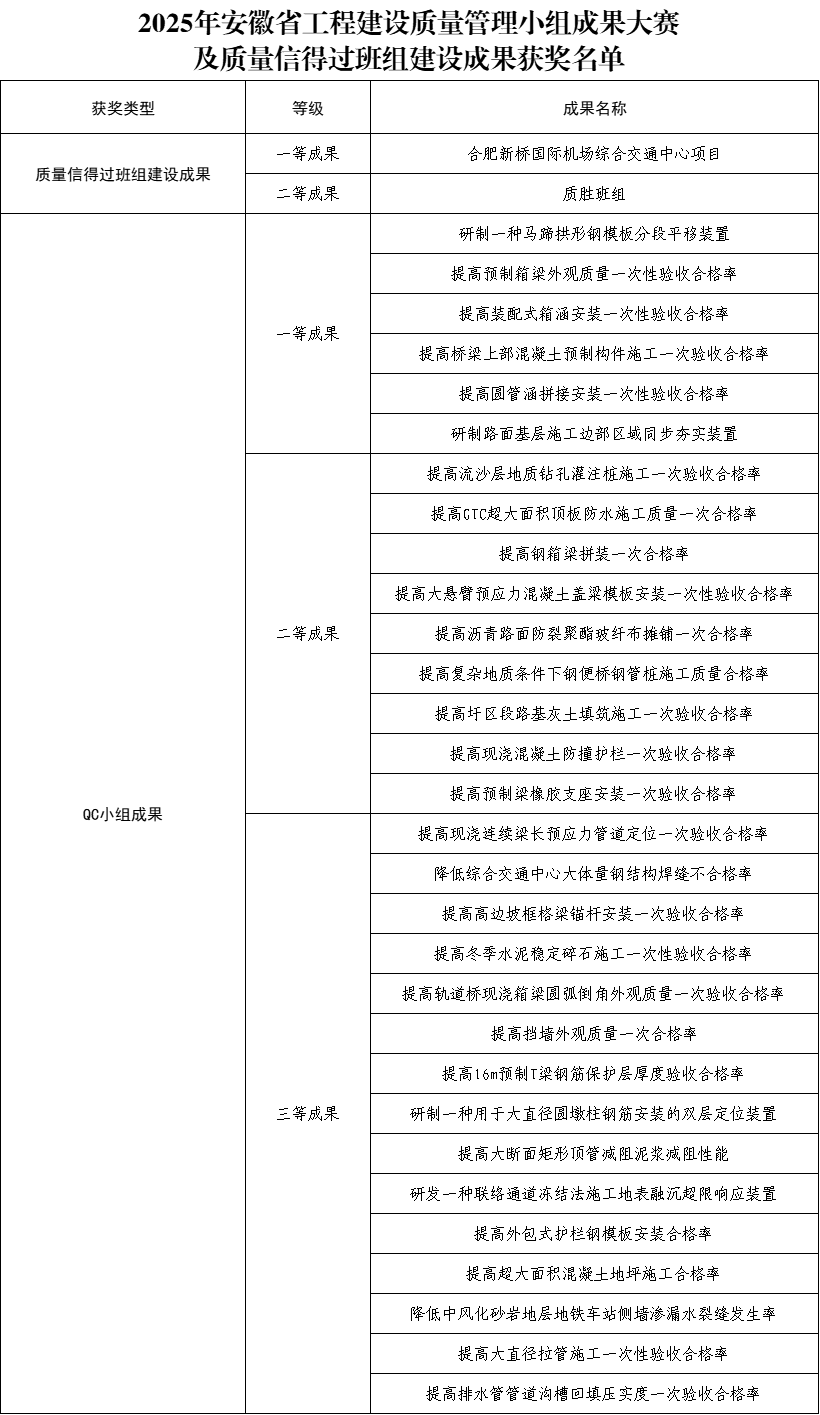 近日,安徽省建設(shè)工程質(zhì)量與安全協(xié)會(huì)公布了2025年安徽省工程建設(shè)質(zhì)量管理小組成果大賽及質(zhì)量信得過班組建設(shè)成果獲獎(jiǎng)名單,公司申報(bào)的30個(gè)QC成果及2個(gè)班組成果榮獲佳績,其中獲得QC成果一等獎(jiǎng)6項(xiàng)、二等獎(jiǎng)9項(xiàng)、三等獎(jiǎng)15項(xiàng),班組成果一等獎(jiǎng)1項(xiàng)、二等獎(jiǎng)1項(xiàng)。