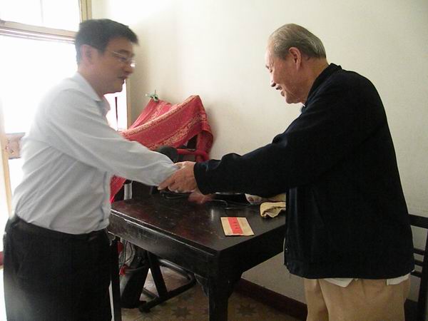 三節(jié)前公司領導到困難老職工家慰問 發(fā)布時間:2009年09月28日 來源:公司黨辦 發(fā)布人: 作者: 瀏覽:4512次 公司黨委積極開展“我們的節(jié)日·中秋”主題活動,組織在國慶、中秋、重陽三節(jié)前夕看望慰問困難老職工,讓他們共享改革開放的成果,為新中國成立60周年營造一個安定、文明、和諧的社會環(huán)境。9月21日至24日,公司總經(jīng)理、黨委副書記汪衛(wèi)東、副總經(jīng)理孫學軍等領導先后看望慰問困難老職工代表,給他們送去了節(jié)日的祝福,并帶去慰問金。