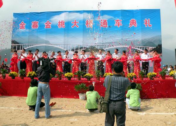 金寨縣委書記沙洪虎在講話中高度贊揚(yáng)了我公司講政治、重大局、作奉獻(xiàn)的精神。省公路局秦勤局長(zhǎng)在代表梅勁廳長(zhǎng)的講話中指出,金桃大橋的建成具有極為重要的政治、經(jīng)濟(jì)意義,大橋在施工中填補(bǔ)了省內(nèi)橋梁施工技術(shù)的數(shù)項(xiàng)空白,該橋建成后將大大改善當(dāng)?shù)貒?yán)重落后的交通狀況,對(duì)促進(jìn)當(dāng)?shù)氐慕?jīng)濟(jì)發(fā)展,提高人民群眾生活水平,造福老區(qū)人民具有極其重要的意義。