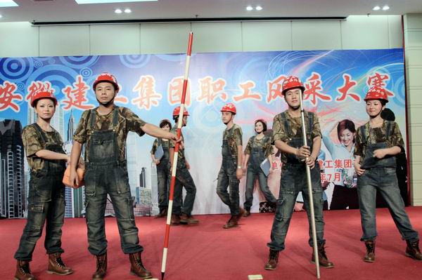 公司12名職工分別展示了三套服裝。第一套職業(yè)裝突破了傳統(tǒng)職業(yè)裝的局限,以背帶牛仔工裝褲為主,別具一格。再搭配安全帽、對講機等施工現(xiàn)場道具,將路橋的職業(yè)特性展示的淋漓盡致,在眾多參賽隊伍中獨樹一幟。第二套時裝,由六位女職工身著綴滿亮片的五彩短裙,在輕快動感的音樂下,充分展現(xiàn)了女職工的青春活力。第三套藝術裝,以晚禮服為主,四位男職工風度翩翩,四位女職工婀娜多姿,凸顯了路橋兒女的別樣情懷。