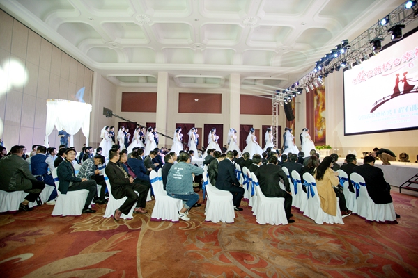 10點(diǎn)10分,一曲精妙絕倫的舞蹈《因?yàn)閻?ài)情》拉開了集體婚禮的帷幕。率先出場(chǎng)的是十二位帥氣的新郎,他們以一段酷炫的舞蹈表達(dá)了心中難以抑制的激動(dòng),將現(xiàn)場(chǎng)氣氛推向高潮。伴著優(yōu)美的樂(lè)曲,十二位美麗的新娘在眾人的注視下緩緩步入會(huì)場(chǎng),來(lái)到新郎身邊。在浪漫的婚禮進(jìn)行曲中新人們雙雙進(jìn)入禮堂,在現(xiàn)場(chǎng)觀眾的見(jiàn)證下彼此交換信物。隨后,美麗的新娘們將手中的捧花拋給在場(chǎng)的單身男女們。