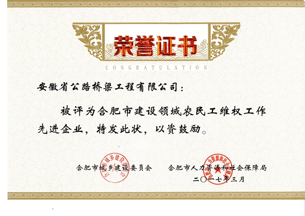 公司榮獲“合肥市建設(shè)領(lǐng)域農(nóng)民工維權(quán)工作先進(jìn)企業(yè)” 稱(chēng)號(hào)