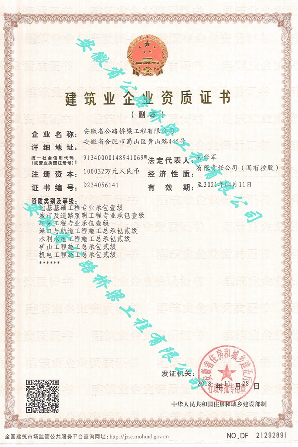 11月28日,公司地基基礎(chǔ)工程專業(yè)承包壹級、城市道路照明工程專業(yè)承包壹級、礦山工程施工總承包貳級三項(xiàng)資質(zhì)順利通過安徽省住房和城鄉(xiāng)建設(shè)廳審查核準(zhǔn)。