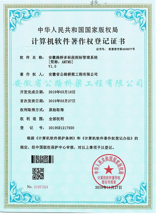 近日,《安徽路橋多標(biāo)段招標(biāo)管理系統(tǒng)V1.0》《安徽路橋關(guān)鍵績效考核管理系統(tǒng)V1.0》等五項(xiàng)管理系統(tǒng)取得國家版權(quán)局頒發(fā)的計(jì)算機(jī)軟件著作權(quán)。