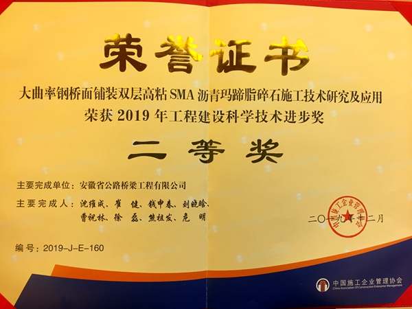 近日,2019年中國施工企業(yè)管理協(xié)會(huì)工程建設(shè)科學(xué)技術(shù)獎(jiǎng)勵(lì)大會(huì)在天津召開,公司主持的課題成果“大曲率鋼橋面鋪裝雙層高粘SMA瀝青瑪蹄脂碎石施工技術(shù)”經(jīng)過專家評(píng)審,榮獲二等獎(jiǎng)。