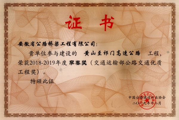近期,由中國(guó)公路建設(shè)行業(yè)協(xié)會(huì)組織的“全國(guó)公路高質(zhì)量發(fā)展云端論壇”正式落幕。期間,以網(wǎng)絡(luò)形式頒發(fā)了2018-2019年度李春獎(jiǎng)。公司參與建設(shè)的“黃山至祁門高速公路”工程榮獲李春獎(jiǎng)。