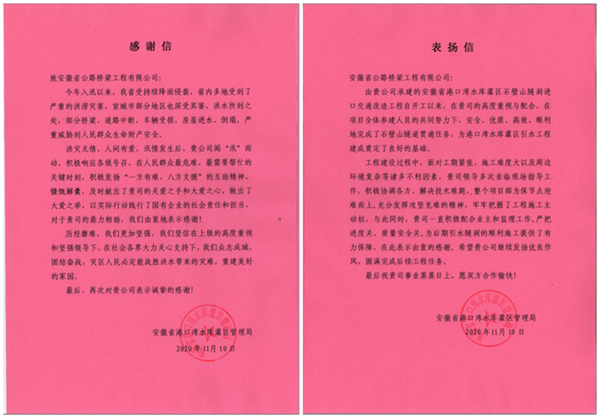 近日,由安徽路橋公司承建的宣城市寧國港口灣水庫灌區(qū)石壁山隧道進(jìn)口交通改造工程獲安徽省港口灣水庫灌區(qū)管理局來信感謝,對(duì)公司在入汛時(shí)發(fā)揮國企擔(dān)當(dāng)、積極抗洪搶險(xiǎn),安全、優(yōu)質(zhì)、高效完成石壁山隧道進(jìn)口交通改造任務(wù)表示感謝。
