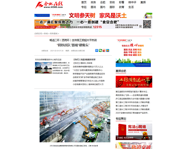 安徽路橋公司承建的暢通二環(huán)(西南環(huán))工程是目前合肥市最重要的市政工程之一。自項目建設以來,備受社會各界的高度關注。特別是在春節(jié)期間,項目鉚足干勁、大干正酣的諸多場景,得到人民網、中國日報、學習強國、安徽衛(wèi)視、中安在線、安徽網、新安晚報、澎湃新聞、合肥日報等眾多媒體的全方位、多角度報道。