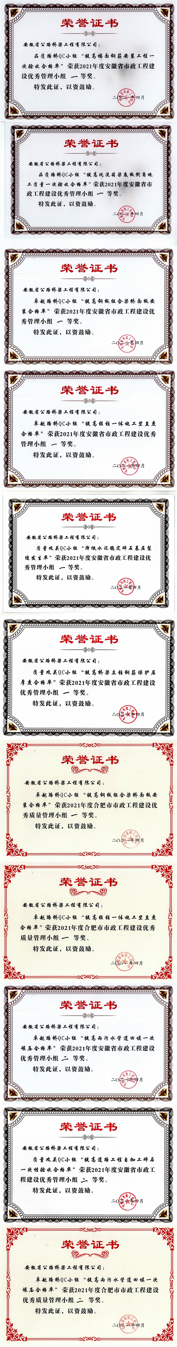 2021年度市政工程建設(shè)優(yōu)秀QC小組活動成果共申報15項,獲得安徽省市政工程優(yōu)秀QC小組一等獎9項、二等獎6項,獲得合肥市市政工程優(yōu)秀QC小組一等獎9項、二等獎6項;同時公司榮獲“安徽省市政工程QC優(yōu)秀企業(yè)”和“合肥市政工程QC優(yōu)秀企業(yè)”。