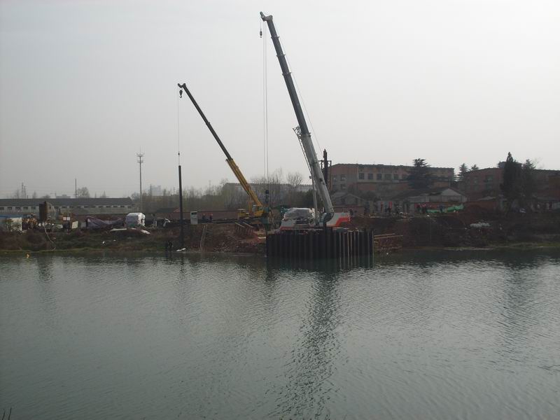 淠望路大橋作為市政工程具有工期緊、任務(wù)重、技術(shù)難度大的特點,但經(jīng)項目部領(lǐng)導(dǎo)精心組織、科學(xué)部署,加大人力與設(shè)備的投入,自2月1日進(jìn)場開工以來,全部90根挖孔樁已開挖41根,累計深度270m;于2月18日開始進(jìn)行關(guān)鍵工序——主墩右幅鋼板樁圍堰施工。由于淠史杭干渠承擔(dān)皖豫兩省14個縣(區(qū))的春耕灌溉任務(wù),六安市重點辦要求加快施工進(jìn)度,必須在4月15日完成所有水下工程及用于水面以上施工的支撐等,并于4月25日前完成圍堰拆除清理工作。項目部立即召開緊急動員會,號召全體技術(shù)人員克服一切困難和挑戰(zhàn),堅決完成上級交代的任務(wù),并立即組織技術(shù)人員根據(jù)鋼板樁長度、水深、地質(zhì)、承臺埋置深度等情況,制定了科學(xué)的施工技術(shù)方案、成立了以項目部經(jīng)理、副經(jīng)理為組長的安全領(lǐng)導(dǎo)小組。施工所用的T90振動錘、70t吊車、25t吊車、PC200挖機(jī)、 T100推土機(jī)、ZLM50裝載機(jī)、自卸車等重型機(jī)械設(shè)備陸續(xù)開進(jìn)施工現(xiàn)場。