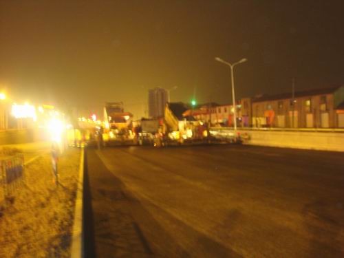 3月22日晚,市政北二環(huán)在昏黃的路燈下,開始攤鋪下穿橋的面層瀝青,以確保北二環(huán)早日暢通,確保工程早日完工。