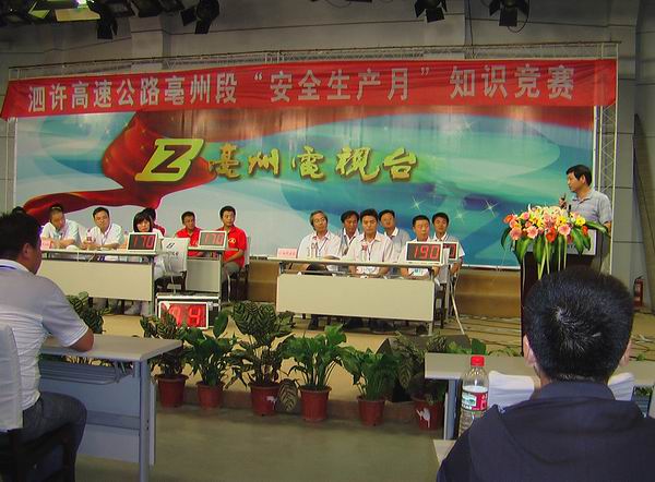 6月12日下午,在亳州市電視臺七樓演播廳舉辦了泗許高速亳州段“安全生產(chǎn)月”知識競賽,此次競賽由泗許高速亳州段建設(shè)辦舉辦,監(jiān)理單位和各施工單位共六支隊伍參加了比賽。亳州市質(zhì)量安全監(jiān)督局副局長程權(quán),泗許高速亳州段建設(shè)辦工程部部長蔡兵出席競賽并擔任競賽評委。