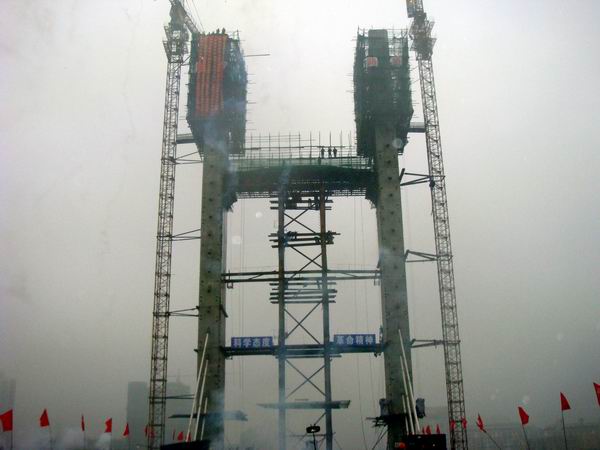 作為整座大橋的控制性工程,主索塔施工一直是各方關(guān)注的焦點(diǎn),并成為影響我項(xiàng)目總體施工進(jìn)度的主要因素。為此,項(xiàng)目部領(lǐng)導(dǎo)班子經(jīng)過(guò)多次研究分析并大膽決策,決定改變以前多點(diǎn)開花,齊頭并進(jìn)的工作方向,將工作重心向主索塔偏移,從人員到設(shè)備優(yōu)先滿足主索塔的施工需要。針對(duì)施工過(guò)程中遇到的技術(shù)難題,項(xiàng)目部及時(shí)邀請(qǐng)有關(guān)專家及公司領(lǐng)導(dǎo)到施工現(xiàn)場(chǎng)指導(dǎo),制定解決方案。在積極趕超進(jìn)度的同時(shí),項(xiàng)目部將安全和質(zhì)量擺放在首要位置。在施工過(guò)程中,項(xiàng)目部不僅建立了完善的安全、質(zhì)量保障體系,更積極增加投入,全方位確保主索塔施工質(zhì)量,并使主索塔施工速度得到穩(wěn)步提升。