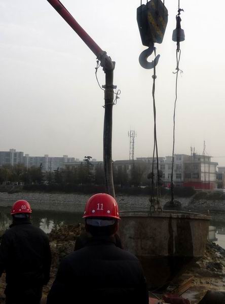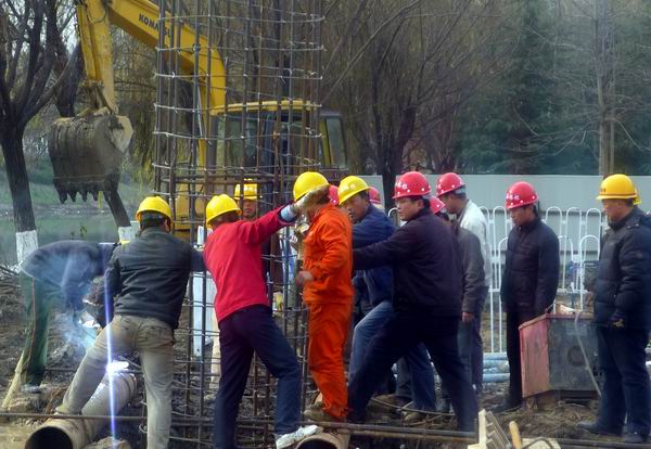 下午2時左右,鋼筋籠開始安裝。項目經(jīng)理李建成和工人一道細心的將鋼筋籠送至樁孔中。導管安裝完畢后,混凝土澆灌開始。到下午4時20分左右,宋斗灣路工程第一根樁澆注完畢,樁基成型。