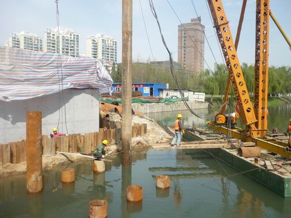 項目部自3月13日開打河中鋼管樁以來,克服了合肥市連續(xù)陰雨天氣和南淝河生態(tài)補(bǔ)水的影響,并努力克服了夜間不能作業(yè)的影響,在異常緊迫的工期壓力下,于4月初完成右半幅一百多根鋼管樁的打設(shè)作業(yè)。并在右半幅貝雷架架設(shè)完成后,開始進(jìn)行左半幅鋼管樁的打設(shè)作業(yè)。目前河中鋼管樁和承臺鋼管樁打設(shè)已經(jīng)全部完成,下一步,項目部將進(jìn)行左半幅滿堂架施工。