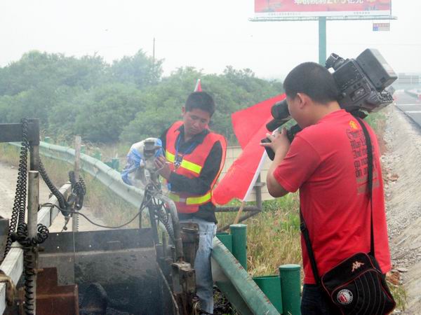 在施工現(xiàn)場,記者們詳細詢問了上面層橡膠瀝青施工的程序及有關(guān)質(zhì)量控制指標,并對現(xiàn)場的施工情況進行了影像記錄。在瀝青施工現(xiàn)場結(jié)束拍攝后,梁局長又帶領(lǐng)大家觀摩了標線完成路段,并接受了記者們的采訪。